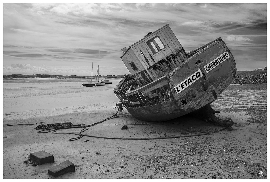 A derelict fishing boat lies neglected on the sands of Portbail harbour in Normandy, France. Camera: Nikon D700. Lens: 28 - 300mm. f3.5 - 5.6.